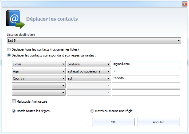 Choisissez si les contacts a déplacer doivent correspondre a toutes les regles énoncées ci-dessus (comptes Gmail, Canada, >= 35 ans) ou au moins un.